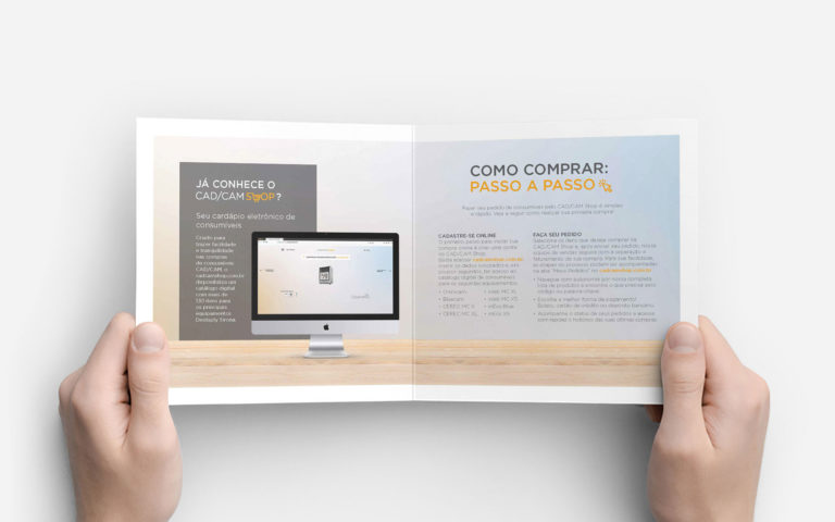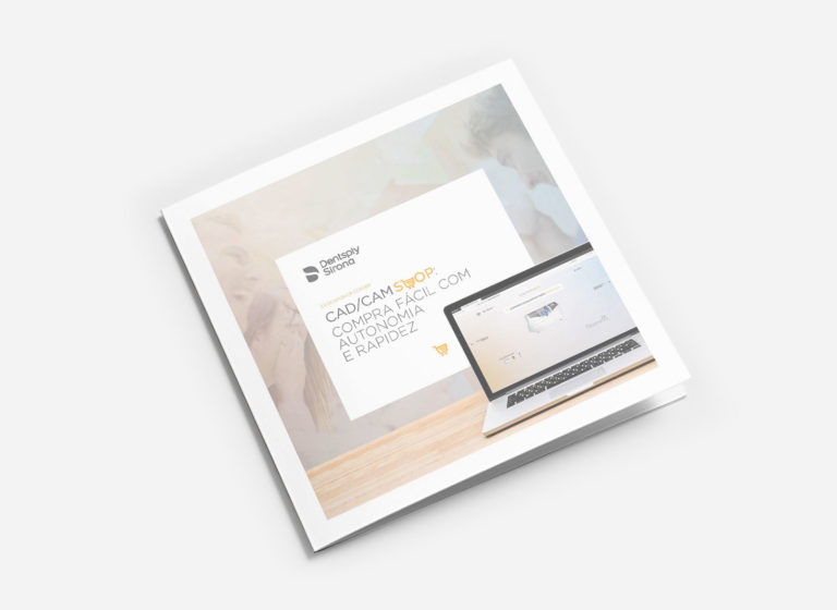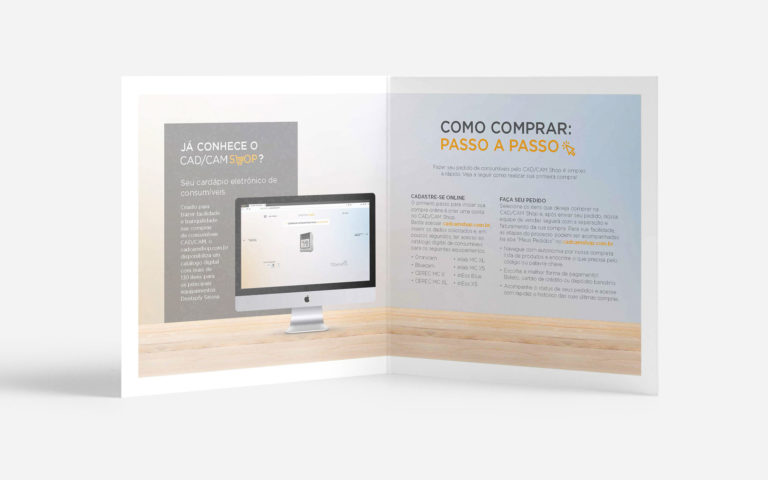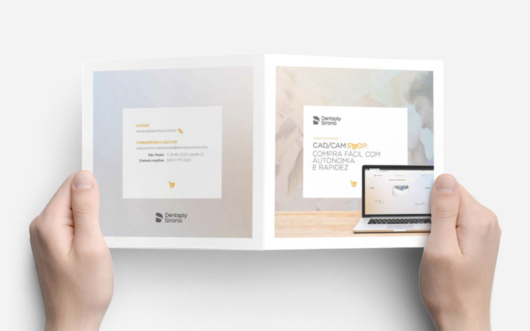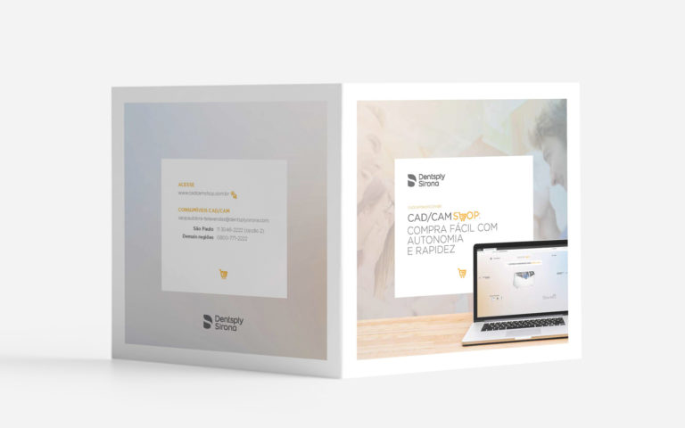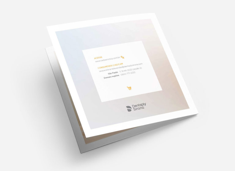 Folheto CAD/CAM Shop da Dentsply Sirona desenvolvido para divulgação de cardápio eletrônico para consumíveis CAD/CAM. A identidade visual precisou ser mantida em todos os meios de comunicação, com tons sóbrios e uma linha de criação mais limpa.
