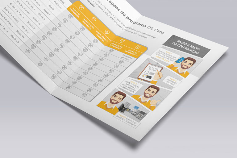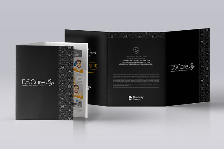 Criação de identidade visual e broadside com informações sobre a Assistência Técnica Preventiva e Exclusiva DS Care da Dentsply Sirona.